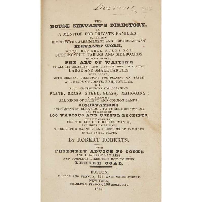 [African Americana] Roberts, Robert The House Servants Directory, or A Monitor for Private Families: comprising Hints on the Arrangements and Performance of Servant’s Work,... The Art of Waiting,... Observations on Servants’ Behavi...