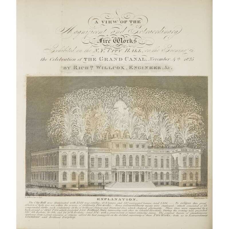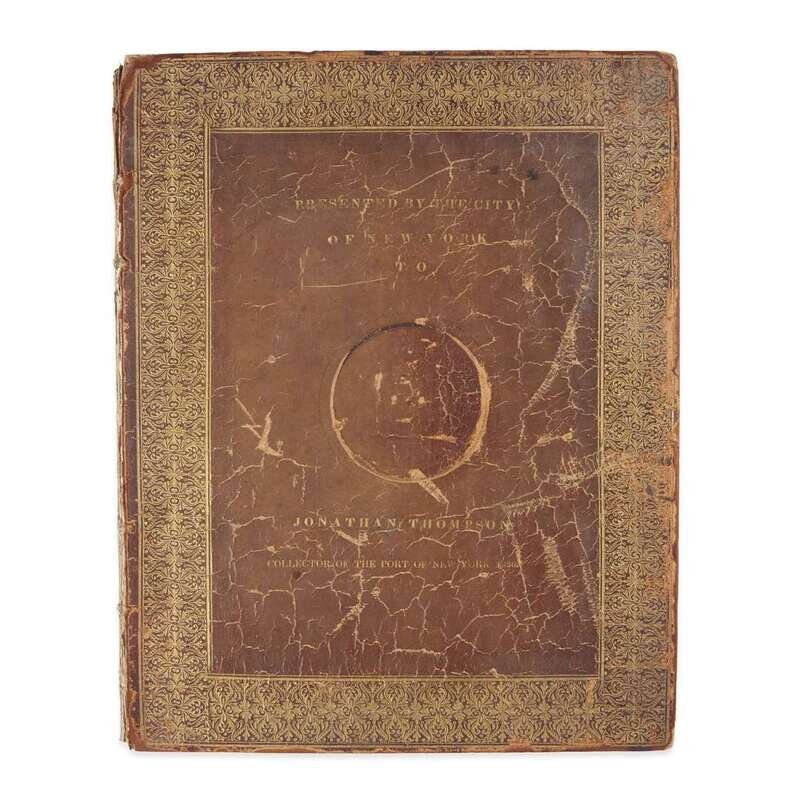 New York: printed by W. A. David, 1825-1826. 4to. (viii), (1)-408, [2] pp. Illustrated with 47 sheets of maps and plates, and eight facsimiles of testimonial letters. Original brown calf presentation binding from the City of New York to Jonathan Thompson, Collector of the Port of New York 1826, richly stamped in gilt, spine gone, scuffed and desiccated, extremities rubbed; some offsetting from plates. Sabin 14279; Howes C-562.