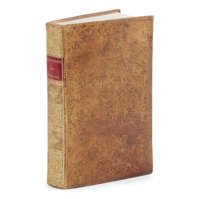 Paris: (no publisher), 1792. Second French edition. Two volumes in one, with separate title-page for second volume. 8vo. (iv), (1)-323, (1); (1)-317, [1 -blank] pp. Translated by Louis-Alexander, duc de La Rochefoucauld d’Enville, with contributions by Benjamin Franklin. Contemporary mottled brown calf, stamped in gilt, red morocco spine label, occasionally scuffed; presumed washed, likely new endpapers. Howes C-716; Sabin 16120.