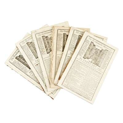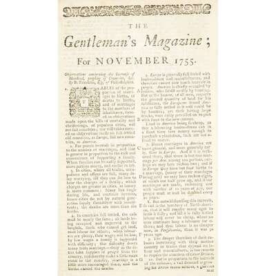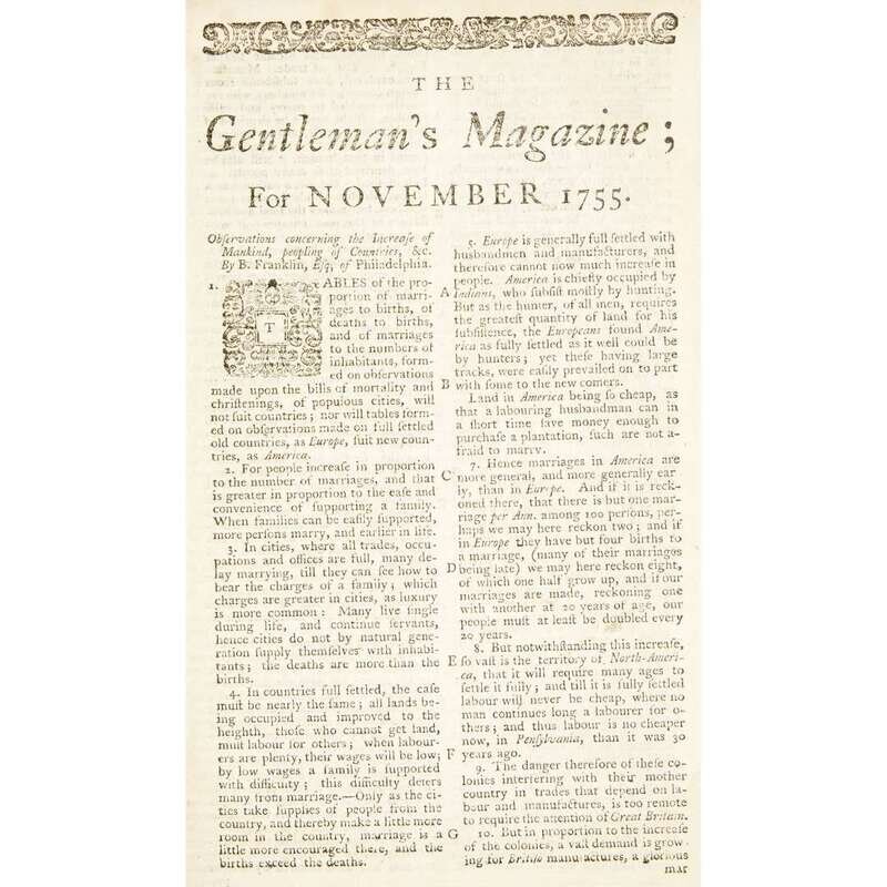 London, July, 1755-February, 1757. In six issues. 8vo. All disbound. Including: 1. July, 1755. Includes: Account of The British Settlement of N. America, New England; Dinwiddie's Speech to the Virginians. Title-leaf detached. 2. November, 1755. Includes: On the increases of Mankind by Benjamin Franklin; Disputes in Pennsylvania; Form of a Bill for uniting the American Colonies; Account of British Settlement... Maryland; Map of Cape Hope. 3. May, 1756. Includes: Plans of Measures for the English provinces in North America; Conduct of the French in America. 4. October, 1756 Includes: Map of Europe. 5. November, 1756. Includes: Map of the country now the seat of war in Germany. 6. February, 1757. Includes: The campaigns in America in 1755, 1756.