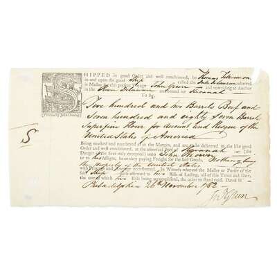 Philadelphia, November 26, 1782. 4 7/8 x 9 in. (123 x 228 mm). Bill of Lading for the 'Duc De Lauzun' bound for Havana, Cuba, with a cargo of beef and flour. Printed by John Dunlap. Partially printed with filled-in manuscript, small chipping to edges.