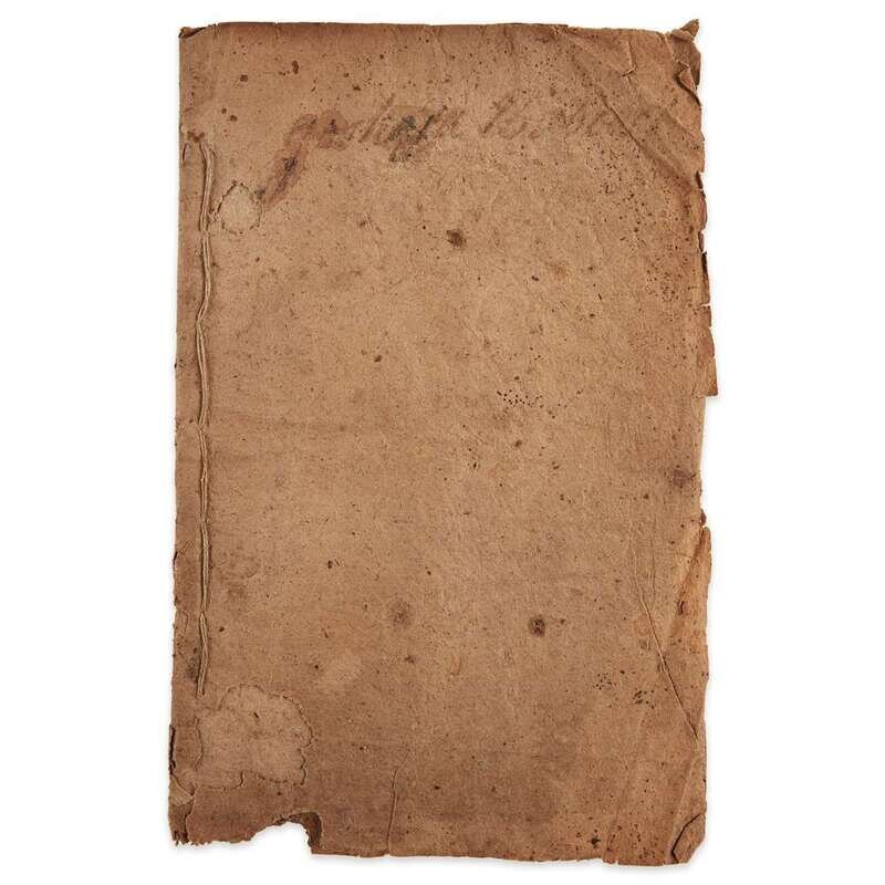 New London, (Connecticut): T. Green & Son, 1791. First edition. 4to. [A]4 B-D4; (1)-29, [3] pp., including terminal blank leaf. Original sewn drab wrappers, toned, chipped at edges, dampstaining; untrimmed. Text moderately toned with some chipping and paper losses at edges, scattered dampstaining, annotations at foot of ads at rear, ownership signature on front wrapper and head of p. (3), text on title-page crossed out in ink. Evans 23495, OCLC 8560733, John Leland; American Imprint Collection (Library of Congress).