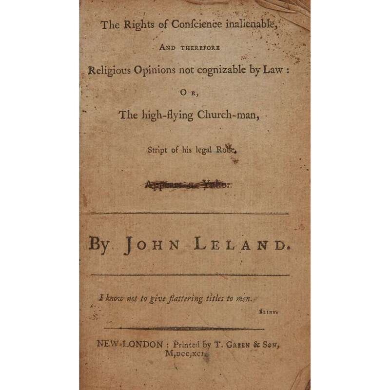 [Americana] Leland, John The Right of Conscience inalienable and Therefore Religious Opinions not Cognizable by Law: Or, The high-flying Church-man...