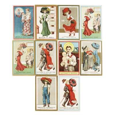 (New York): Dunston-Weiler Lithograph Co., 1909. Original lithographic postcards. From the Suffragette Series, including nos. 1, 2, 3, 4 (two copies, with alternately printed border), 7 (two copies, with alternately printed border), 9, 10, 12. Each 5 1/2 x 3 1/2 in. (140 x 89 mm).