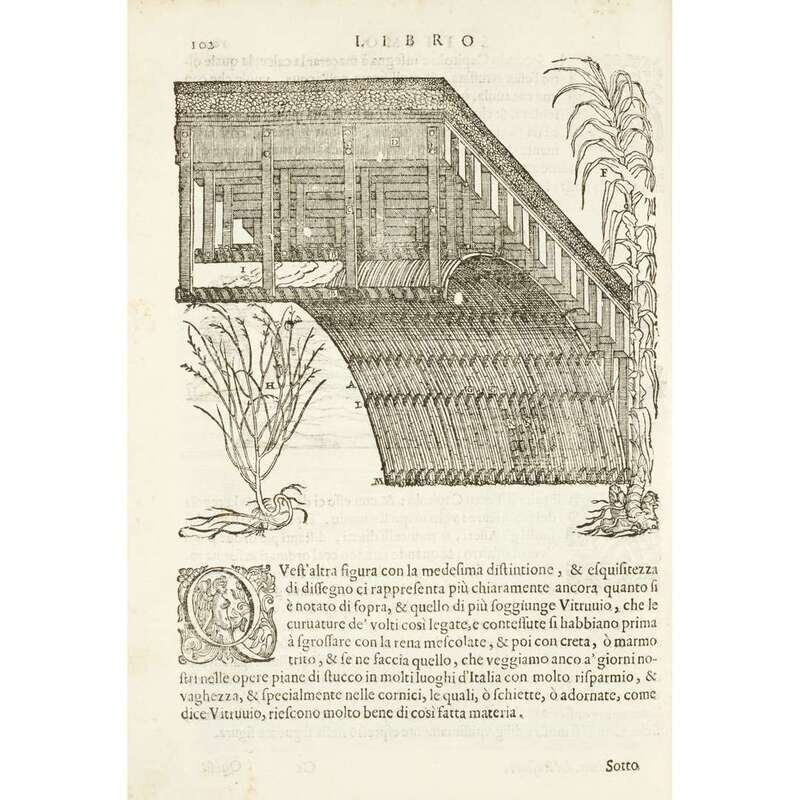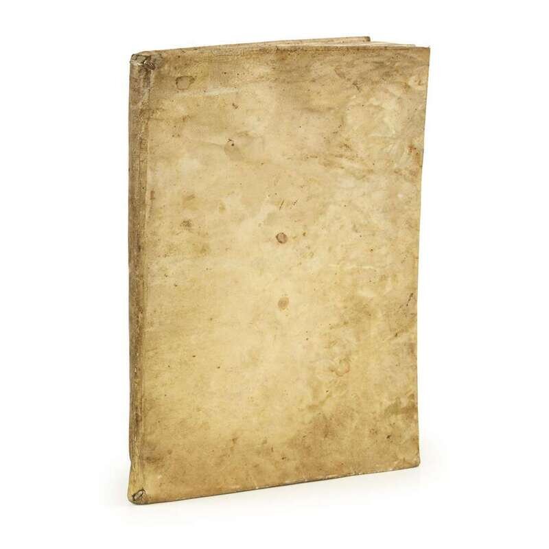 Venice: Nicolini, 1660. Second edition. Folio. [12], 1-148 pp. Including an article on sundials illustrated with a sundial which is not present in the first edition of 1590. Illustrated with pictorial title-page and numerous woodcut illustrations. Bound in old vellum, some dust soiling and small blistering, slightly affected by damp; hinges cracked or stressed but holding, slightly trimmed but with good margins, occasional minor dampstaining and foxing, primarily at blank edges.