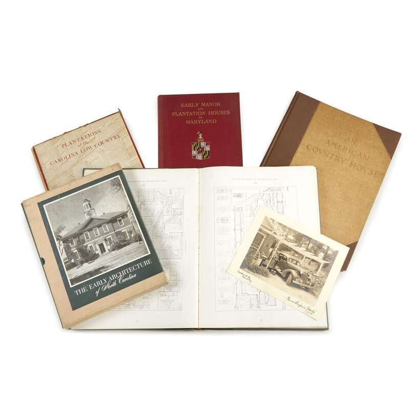 Location varies, 1923-1941. Size and condition varies. Included with this lot is a photograph of Frances Benjamin Johnston, shot by her assistant and driver Huntley Ruff, and presumably titled and signed by her below image. Including: 1. Forman, Henry Chandlee. Early Manor and Plantation Houses of Maryland. Maryland and Pennsylvania, 1934. First and only edition. 2. Johnston, Frances Benjamin. The Early Architecture of North Carolina. Chapel Hill, (North Carolina), 1941. First edition. In original slipcase. 3. Mellor Meigs & Howe. A Monograph of the Work of Mellor Meigs & Howe. New York, 1923. Lacking dust-jacket. 4. Mellor Meigs & Howe. An American Country House. New York, 1925. Signed by the firm "Mellor Meigs & House/1925" on front free endpaper. Lacking dust-jacket. 5. Stoney, Samuel Gaillard. Plantations of the Carolina Low Country. Charleston, South Carolina, 1938. First edition. In original dust-jacket and slipcase.