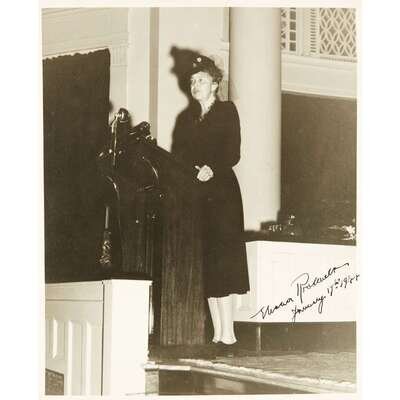 Gelatin silver print. Signed and dated “January 17th, 1944” by Roosevelt as First Lady. Full length portrait at a lectern at Voorhees Chapel at the New Jersey College for Women, later named Douglass College, at Rutgers-New Brunswick. Approximately 10 x 8 in. (254 x 203 mm). In frame.