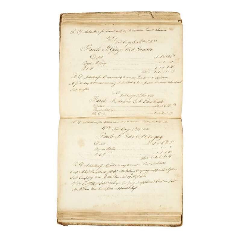 Fort George, (United Kingdom). October 9, 1799-January 27, 1801. 4to, 8 x 6 1/2 in. (165 x 202 mm). Original diced calf-backed boards, worn and partially dampstained; approximately 240 pp. of dense ink entries, some dampstaining throughout, some leaves torn with paper losses, but almost entirely legible.