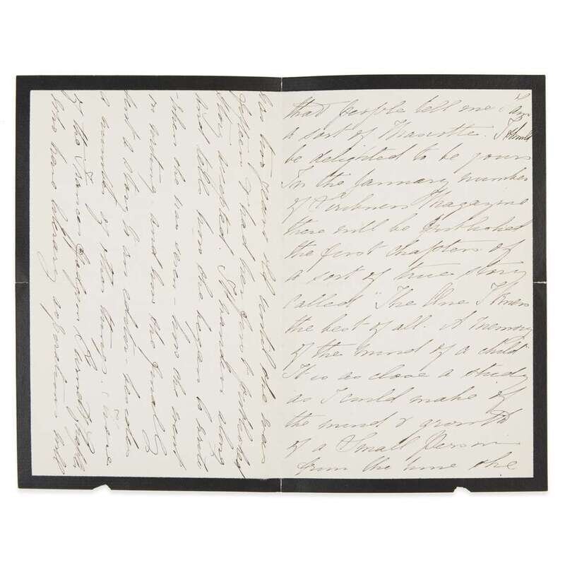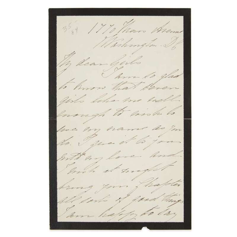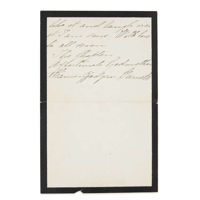New York: Charles Scribner's Sons, 1886. First edition, first issue with DeVine Press imprint on p. 210. 4to. 4 pp. A.L.s. by Burnett laid in, signed "Affectionate Godmother/Frances Hodgson Burnett". Publisher's green cloth, stamped in red, black, and gilt, extremities with light wear and darkening to spine, slightly cocked; brown coated endpapers, slight tear at front hinge, starting at half-title, rear hinge starting but sound.
