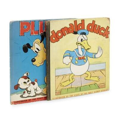 New York: Grosset and Dunlap, 1936, 1937. Together two volumes. First editions. 4to. Publisher's brown linen spine over illustrated paper-covered boards with wear to corners and extremities; illustrated endpapers; a very good copy (Donald Duck); publisher's illustrated paper-covered boards and matching dust-jacket with large chip out of bottom edge of front panel; illustrated endpapers; a near-fine copy (Pluto).