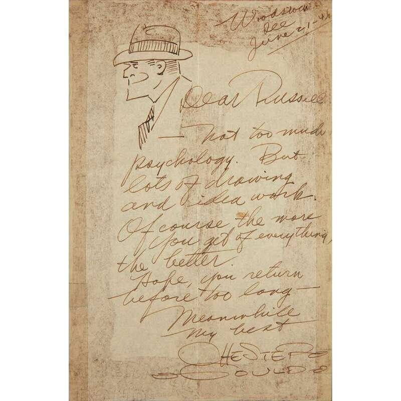 June 21, 1946, 15 years into the life of the strip of his most famous creation, detective Dick Tracy. 8.5 x 5.5 in. Letter mounted with sellotape on black paper; offsetting from additional glue mounting; 1985 obituary of Gould mounted to verso.