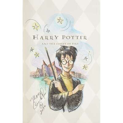 New York: Scholastic Press, 2000. First American edition, limited issue of 25 copies with an original color pencil and ink illustration by Mary GrandPré, signed by her with 2000 copyright date. 8vo. Publisher's quarter black cloth over orange diamond-patterned paper boards, with very minor shelf wear to bottom edge; purple endpapers; in original pictorial dust-jacket with $25.95 price intact.