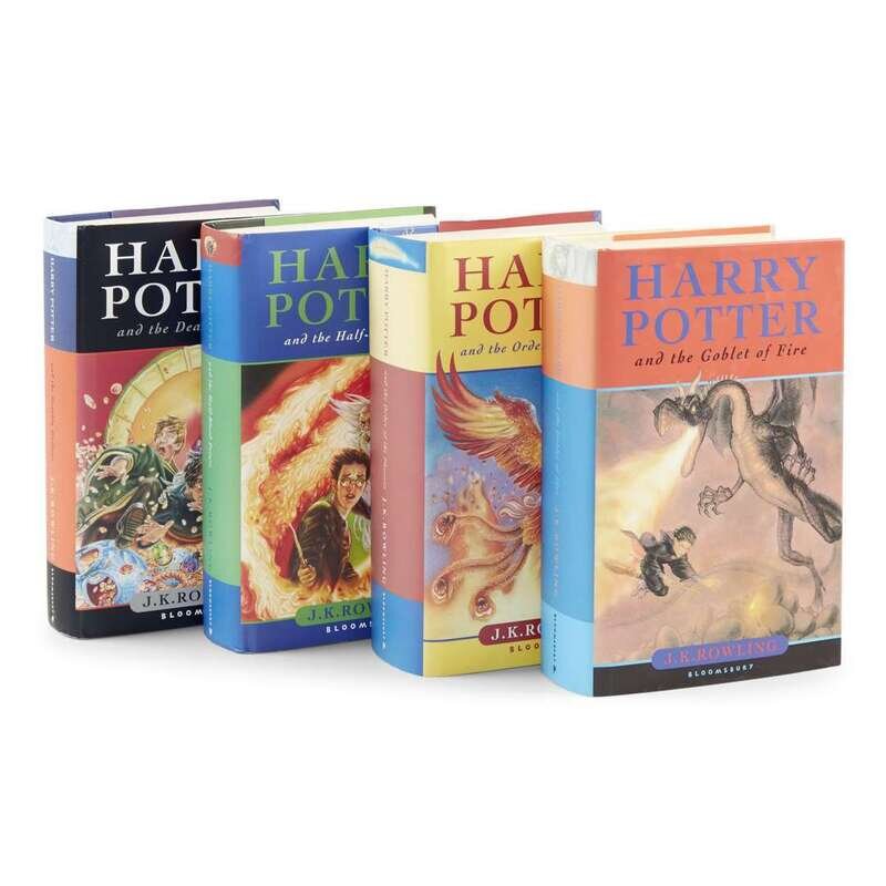 Including: 1. Harry Potter and the Goblet of Fire London: Bloomsbury, 2000. First edition, first printing. 8vo. Publisher's pictorial paper-coverd boards; in matching pictorial dust-jacket, spine panel faded, front flap with "Ff 189" sticker over printed price. Errington A9(a) 2. Harry Potter and the Order of the Phoenix London: Bloomsbury, 2003. First edition, first printing. 8vo. Publisher's pictorial paper-covered boards; in matching pictorial dust-jacket, spine slightly faded, with "English Book Centre" sticker over printed price; with publisher's door sign, bookmark, and other promotional material laid in. Errington A12(A). 3. Harry Potter and the Half-Blood Prince London: Bloomsbury, 2005. First edition, first printing. 8vo. Publisher's pictorial paper-covered boards; in matching pictorial dust-jacket, with "27E50" sticker over printed price on front flap, extremities lightly bumped. Errington A13(a). 4. Harry Potter and the Deathly Hallows London: Bloomsbury, 2007. First edition, first printing. 8vo. Publisher's pictorial paper-covered boards; in matching pictorial dust-jacket, "English Book Centre" sticker over printed price on front flap, spine ends with minor creasing. Errington A14(a).