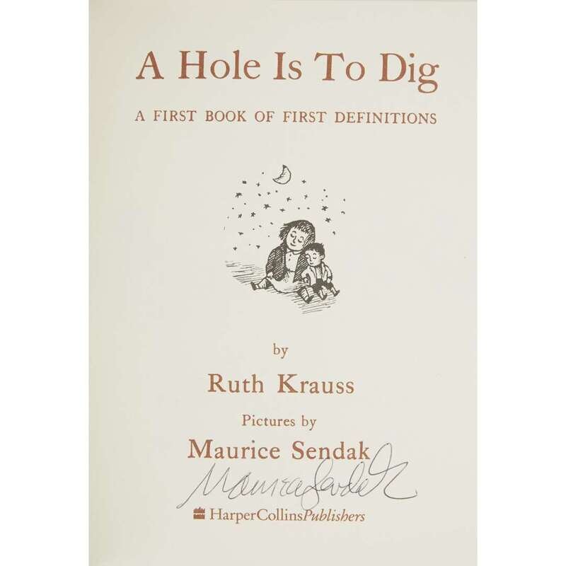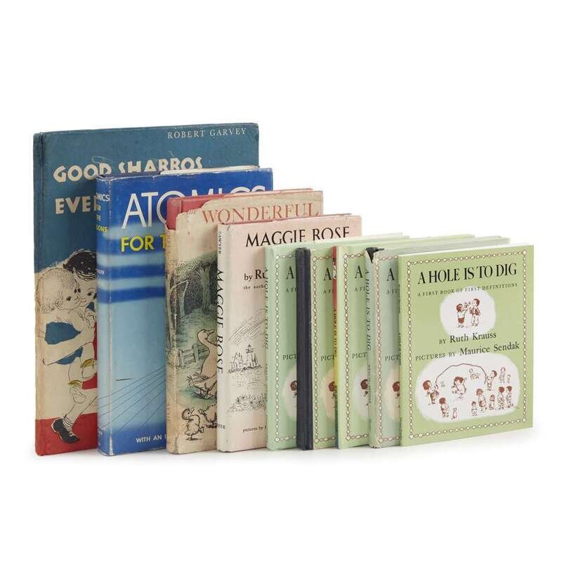 Including: 1. Eidinoff, Maxwell Leigh, and Ruchlis, Hyman. Atomics For the Millions. New York: McGraw/Whittlesey, (1947). Second printing. 8vo. Publisher's blue cloth stamped in red and in gilt, in original dust-jacket with light wear to extremities, price-clipped. Sendak's first illustrated book. Hanrahan A1 2. Ayme, Marcel. The Wonderful Farm. New York: Harper Brothers, (1951). 8vo. Publisher's red cloth, in original dust-jacket with wear to extremities and loss to spine head. Scarce. Hanrahan A2 3. Garvey, Robert. Good Shabbos, Everybody. United Synagogue Commission, 1951. First edition. 4to. Publisher's pictorial paper-covered boards, some wear and soiling. Hanrahan A3 4. Sawyer, Ruth. Maggie Rose: Her Birthday Christmas. New York: Harper Brothers, (1952). First edition. 8vo. Publisher's pink cloth, in original dust-jacket with some repairs. Hanrahan A4 5. Krauss, Ruth. A Hole is to Dig: A First Book of First Definitions. New York: Harper & Brothers, (1952). 12mo. Five copies (first edition in dust-jacket; first edition lacking dust jacket; 1980 reprint signed by Sendak; 1989 reprint in boards; 1989 reprint in wrappers). Hanrahan A5.