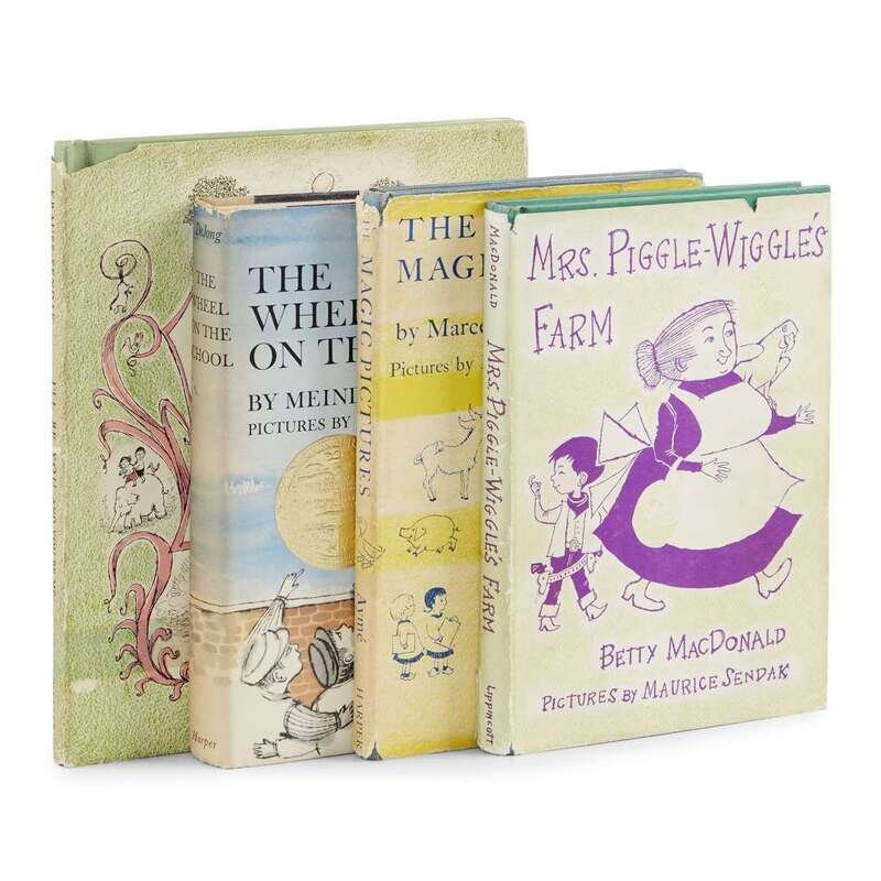 Including: 1. Ayme, Marcel. Magic Pictures: More About the Wonderful Farm. New York: Harper & Brothers, (1954). First edition. 8vo. Publisher's blue cloth, in original dust-jacket with some wear. Hanrahan A10 2. Dejong, Meindert. The Wheel on the School. New York: Harper & Brothers, (1954). Second issue. 8vo. Publisher's beige and black cloth, in original dust-jacket with Newbery award sticker to front panel. Hanrahan A11 3. Krauss, Ruth. I'll Be You and You Be Me. New York: Harper & Brothers, (1954). Early issue. 4to. Publisher's green cloth, in original dust-jacket, title-page with rubber stamp reading "Harper & Row Library-Evanston". Hanrahan A12 4. MacDonald, Betty. Mrs. Piggle-Wiggle's Farm. New York and Philadelphia: J. B. Lippincott, (1954). Eighth printing. 8vo. Publisher's green cloth, in the original dust-jacket, price-clipped. Hanrahan A13.