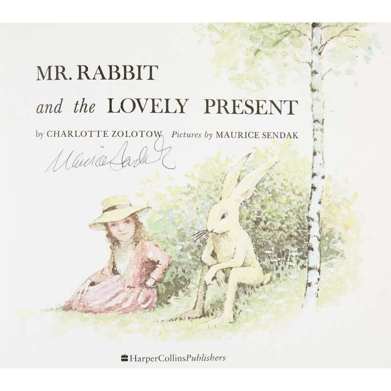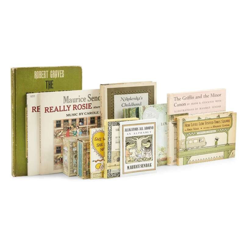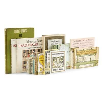 Including: 1. Graves, Robert. The Big Green Book [New York]: Crowell-Collier Press, (1962). First edition. 4to. Publisher's green pictorial boards, with some wear to extremities; lacking dust-jacket. Hanrahan A50 2. Sendak, Maurice. The Nutshell Library: Alligators All Around, Chicken Soup with Rice, One Was Johnny, Pierre New York: Harper & Row, (1962). Four volumes in slipcase. First edition. 24mo. Publisher's cloth, in original dust-jackets and pictorial slipcase, with some wear to extremities. Including a later edition of same in slipcase and original shrink wrap, and a later edition of Alligators All Around in glossy pictorial wrappers. Hanrahan A51 3. Zolotow, Charlotte. Mr. Rabbit and the Lovely Present New York: Harper & Row, 1962. First edition. Oblong 8vo. Publisher's pictorial wrappers, lightly worn to spine; lacking original dust-jacket. Hanrahan A52 4. Zolotow, Charlotte. Mr. Rabbit and the Lovely Present New York: HarperCollins, (1977). Reprint. Oblong 8vo. Signed by Sendak to title page. Publisher's pictorial boards; in original dust-jacket with Caldecott Honor medal to front panel. Hanrahan A52 5. Keeshan, Robert. She Loves Me... She Loves Me Not... New York: Harper & Row, (1963). First library edition with $2.19 price intact at bottom of front flap. 24mo. Publisher's pictorial boards; in the original dust jacket with Harper Crest sticker to spine. Hanrahan A53 6. Orgel, Doris. Sarah's Room. New York: Harper & Row, (1963). Early edition. 12mo. Publisher's pictorial boards, front free endpaper with rubberstamp reading "Donated by Xerox"; in matching pictorial dust jacket with Harper Crest sticker to spine, lightly worn. Hanrahan A54 7. Stockton, Frank R. The Griffin and the Minor Canon. New York: Holt, Rinehart and Winston, (1963). First library edition with $3.27 price intact at bottom of front flap. Square 8vo. Publisher's boards; in original dust jacket with Holt Library Edition sticker to spine and closed tear to top edge; ex-library copy with the usual marks. Hanrahan A55. 8. Tolstoy, Leo. Nikolenka's Childhood. New York: Random House (1963). First edition. 8vo. Publisher's cloth; in the original dust jacket with $3.95 price intact. Hanrahan A56 9. Vogel, Amos. How Little Lori Visited Times Square. New York: Harper & Row, (1963). Stated first edition, dust jacket matching all first edition points except price, which is clipped. Oblong 8vo. Publisher's pictorial boards; in original dust jacket. Hanrahan A57. 10. Sendak, Maurice. Really Rosie, Starring the Nutshell Kids. New York: Harper & Row, (1975). First edition. Oblong 4to. Publisher's pictorial wrappers. Also with a Harper Trophy Edition.
