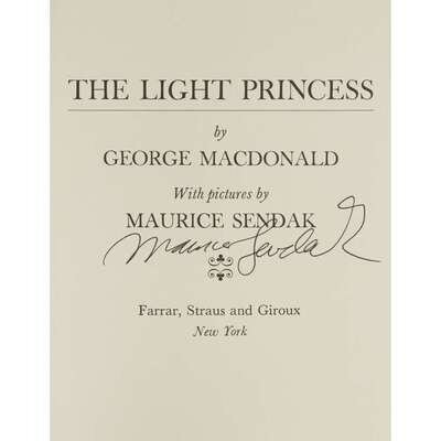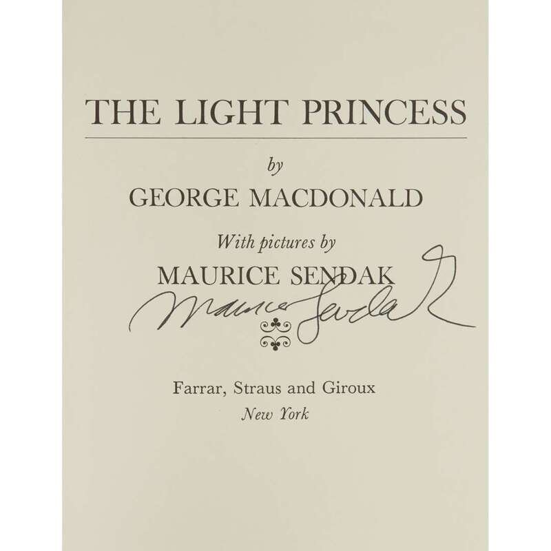 New York: Farrar, Straus and Giroux, (1967). First edition. 8vo. Publisher's cloth; in original dust-jacket with $3.95 price intact. Hanrahan A67. With The Golden Key New York: Farrar, Straus and Giroux, (1976). Second edition. 8vo. Signed by Sendak to half-title. Publisher's cloth; in original dust-jacket with no price. Hanrahan A67. The Light Princess New York: Farrar, Straus and Giroux, (1969). First edition. 8vo. Signed by Sendak to front free endpaper. Publisher's cloth; in original dust-jacket with $3.95 price intact, some wear to extremities, closed tear to top of spine panel. Hanrahan A71 The Light Princess New York: Farrar, Straus and Giroux, (1969). First edition. 8vo. Publisher's cloth; in price clipped dust-jacket. Hanrahan A71 The Light Princess New York: Farrar, Straus and Giroux, (1977). Second printing. 8vo. Signed by Sendak to title page. Publisher's cloth; original dust-jacket. Hanrahan A71.