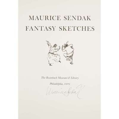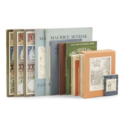 Including: 1. Fantasy Sketches Philadelphia: The Rosenbach Foundation, 1970. First edition. 4to. Publisher's pictorial wrappers, staple-bound. Also with a third edition from 1982. Hanrahan A74. 2. In the Night Kitchen (New York): HarperCollins, [1995]. Twenty-fifth Anniversary Edition. 4to. Signed by Sendak to title page. Publisher's white cloth; in the original dust-jacket. Including an unsigned twenty-fifth anniversary edition. Hanrahan A75 3. Luca la luna e il latte (In the Night Kitchen) (Italy): Emme Edizione, (ca. 1970). Italian edition. 4to. Signed by Sendak with an original drawing to front free endpaper. Publisher's boards. (Hanrahan A75) 4. Ten Little Rabbits, A Counting Book with Mino the Magician Philadelphia, The Rosenbach Foundation, 1970. First edition. 24mo. Publisher's blue marbled paper wrappers. Hanrahan A76. 4. Grimm, [Jacob and Wilhelm]. The Juniper Tree, And Other Tales from Grimm In two volumes. First edition. 12mo. Publisher's brown cloth; in the original dust-jackets, housed in publisher's box. Including an early edition of the first volume of the 1976 paperbound edition. Hanrahan A82. 5. Grimm, [Jacob and Wilhelm]. King Grisly-Beard, A Tale from the Brother's Grimm New York: Farrar, Straus & Giroux, (1973). 8vo. First edition. Publisher's maroon cloth, lacking dust-jacket, pencil marks to front board. With an additional copy of the same title, early reprint. Hanrahan A84. 6. Aulnoy, [Marie Catherine] d'. Fortunia New York: Frank Hallman, (1974). Translated by Richard Schaubeck. Limited edition of 300 copies, signed by the author and translator. 8vo. Publisher's blue wrappers. Hanrahan A87.