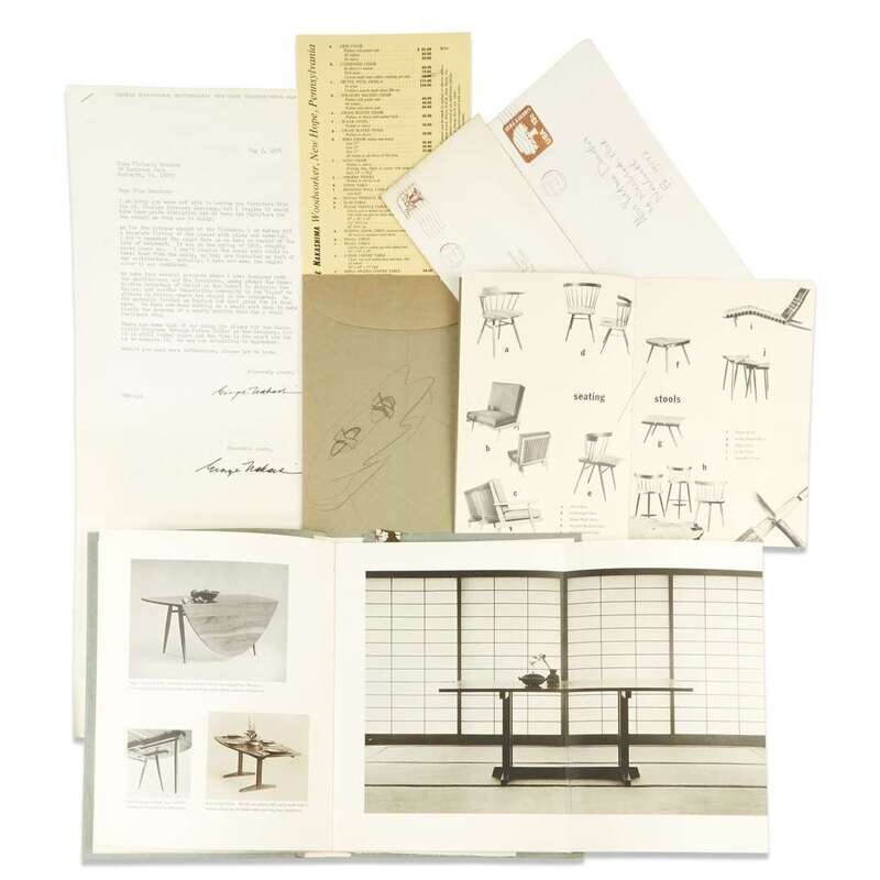 New Hope, July 29, 1975-May 5, 1976. Including four typed letters, signed. Each 1 p., 4to. All on Nakashima's Woodworker, New Hope, Pennsylvania letterhead. Each to Victoria Donohoe, all relating to liturgical woodworking projects undertaken by Nakashima. All written in response to requests to participate in liturgical arts exhibitions administered by Donohoe (likely for the 41st Eucharistic Congress, to be held in Philadelphia in August of 1976). Including two promotional Nakashima publications: "George Nakashima, Woodworker" (New York: Harbor Press, 1962). 4to. Original hand-made green paper wrappers over stiff white wrappers; minor wear, with stapled Nakashima catalogue (Spring, 1962) laid in. The publication is signed and dated, "April 1962," in ink at foot of second front text leaf by Nakashima. And "George Nakashima, Woodworker" New Hope, (ca. 1954). 8vo. Original pictorial stapled green wrappers. Nakashima price list laid in. With original mailing envelope with Nakashima's label addressed to Donohoe and postmarked December, 1954.