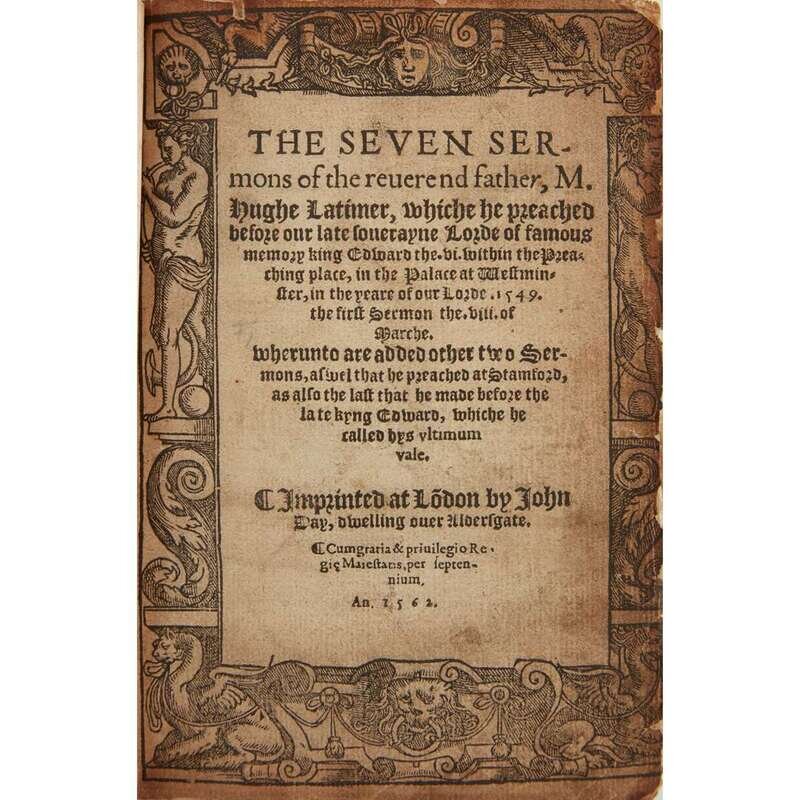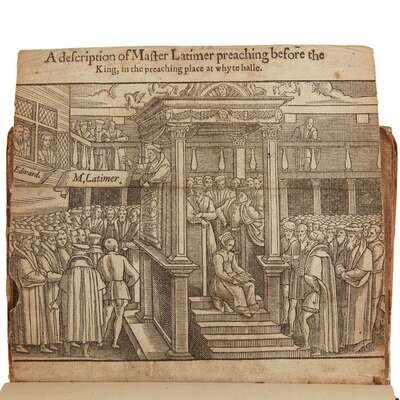 London: John Day, 1562. 4to. [3] leaves, 23-122, two leaves in manuscript, 124-149 (i.e. 128), two leaves in manuscript; [5] leaves; 148 leaves; 22 leaves (D8-Q8; A4, C2; B8-U4; A8-C6); numerous errors in pagination. Leaves A8-C6 presumably misbound at rear; lacking part title A1, presumably for "Certain godly sermons..."; three leaves lacking and supplied in manuscript (leaves Q1, Q7-8). Illustrated with one folding woodcut plate at front. 20th century quarter brown goat over marbled paper-covered boards, spine stamped in gilt; all edges trimmed. Text trimmed close, affecting some sidenote letters; woodcut at front trimmed close, affecting some image area, with a small repair to fold; text leaves toned; edges slightly darkened, scattered soiling to same; top edge of leaf N7 repaired; scattered minor soiling, more pronounced soiling to P7v and P8, E6, K4, M8v, and at foot of P3-4; small hole at center of leaf N6; fore-edge of terminal leaf (C6) repaired; small chipping and closed tears to fore-edges and corners of most leaves; occasional marginal manuscript annotations. STC 15276.