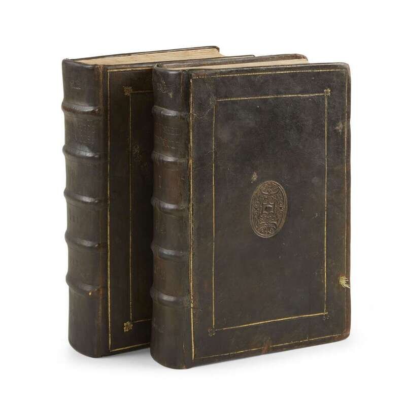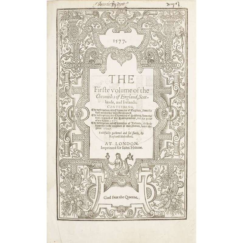 London: John Hunne, 1577. In two volumes. First edition, second state (as per Pforzheimer copy). Presumed married set, as indicated by different ownership signatures in each volume. Folio in eights. 662 leaves; 820 leaves. One-page errata bound in at front of first volume, 6 pp. errata bound in at rear of same. Illustrated with many in-text woodcut illustrations in each volume, and one double-page woodcut map of "Edinburg", trimmed and presumably supplied from another copy, in second volume. First volume bound in contemporary calf boards, stamped in blind and in gilt, sometime rebacked, front and rear boards blistered; second volume tastefully bound to match first; all edges trimmed. First volume: some dampstaining to fore-edge of several text leaves; some quires lightly toned; title-page and dedication for the History of Irelande bound out of order; paper-making fault in bottom edge of p. 94/95 in the Description of Britaine and in fore-edge of pp. 289/290 in The Historie of Englande; small paper loss in fore-edge of pp. 151/152 in The Historie of Scotlande just touching sidenotes, and in bottom corner of pp. 245/246 of same affecting a few sidenote letters, and in bottom edge of pp. 11/12 in The Historie of Irelande. Second volume: scattered dampstaining to fore-edges, bottom edge of title-page repaired; paper-making fault in fore-edge of pp. 449/450 affecting a few letters in same; repair in fore-edge of pp. 1415/1416. Both volumes: text leaves slightly trimmed; scattered spotting and soiling; scattered neglible paper faults and repairs; occasional manuscript notations; old ownership signatures on each title-page. ESTC 006198939; STC 13568b; Pfzorheimer 494.