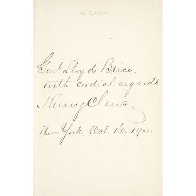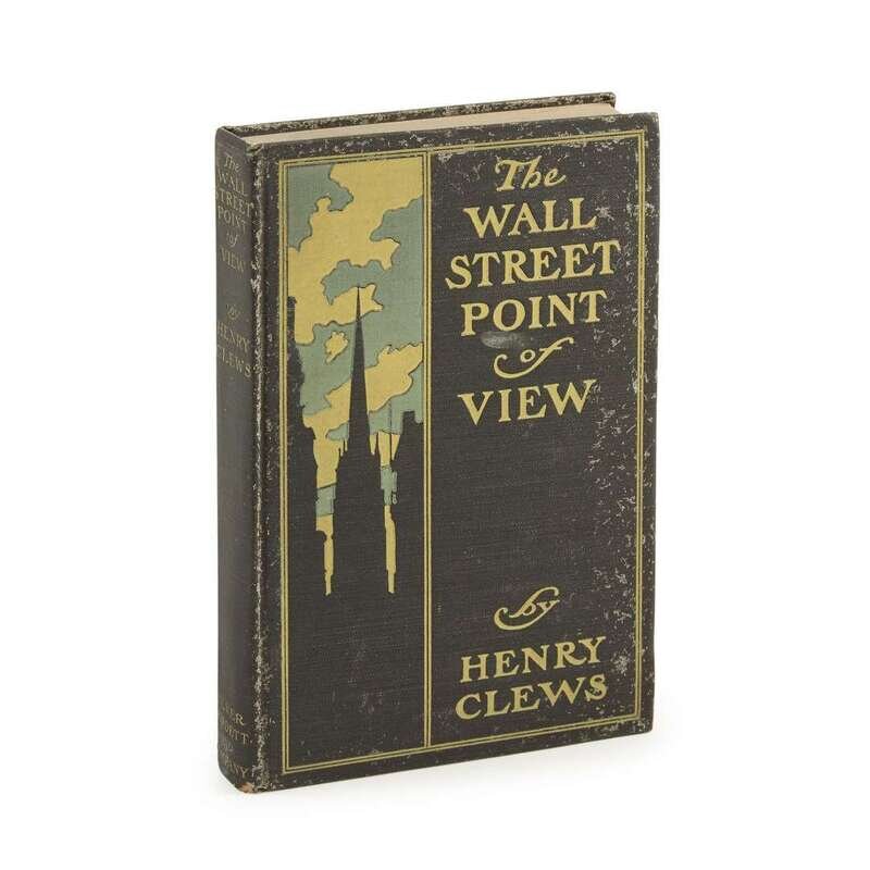New York, etc: Silver, Burdett and Company, (1900). First edition. 8vo. 290 pp. Presentation copy, inscribed by Clews to U.S. Representative Lloyd Brice on front free endpaper: "Gen. Lloyd Brice,/with cordial regards/Henry Clews/New York, Oct. 16, 1900". Illustrated with frontispiece portrait of Clews. Publisher's pictorial blue and yellow cloth-covered boards, spine lettered in gilt, front and rear boards lightly rubbed, spine ends very lightly worn; all edges trimmed.
