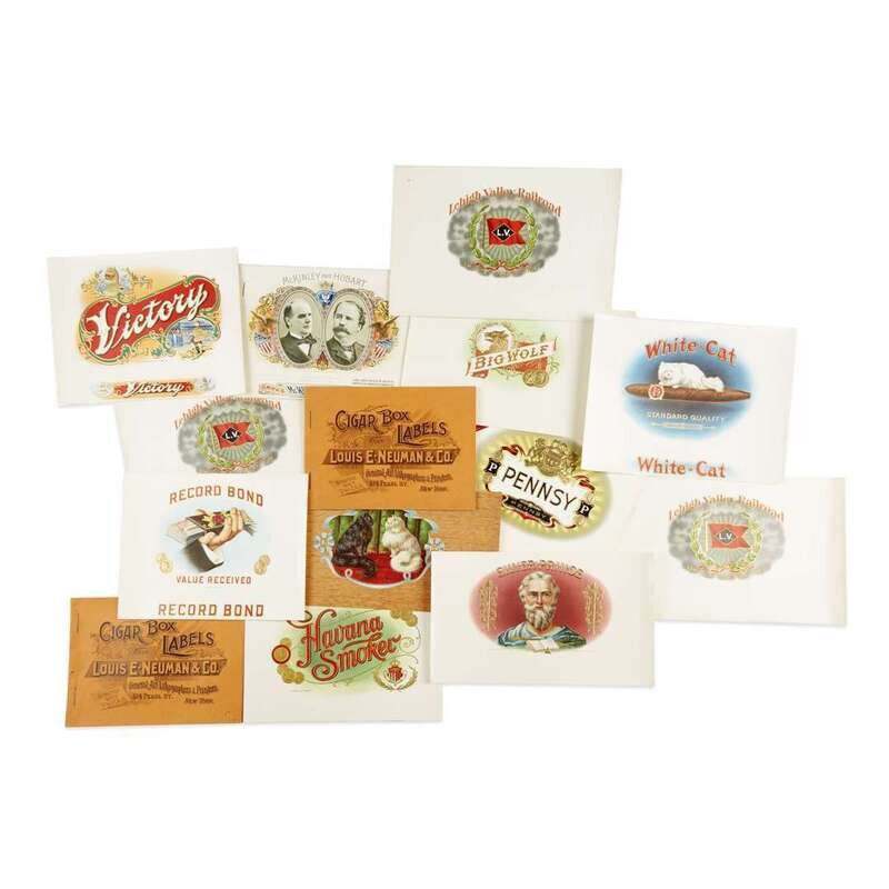 New York, ca. late 19th century. Group of three richly illustrated chromolithographic cigar label booklets from Schmidt & Co. and Louis E. Neuman & Co., and 11 loose chromolithographic cigar label sheets. Size and condition varies.