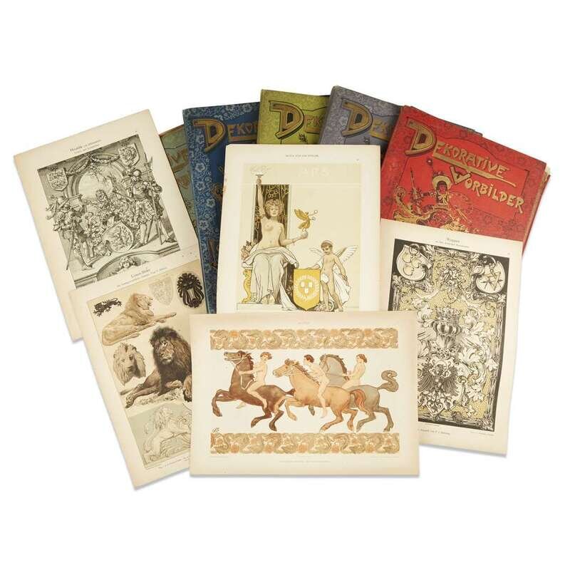 (Stuttgart: Julius Hoffmann), (1889-1906). Plates: 13 3/4 x 10 in. (349 x 254 mm). Collection of approximately 230 chromolithographic and other plates, housed in five Dekorative Vorbilder cloth portfolio cases from years 1894, 1895, 1896, 1897, and 1898. Each decoratively stamped in color and in gilt, scattered soiling and chipping to a few blank margins. With Dekorative Vorbilder color and gilt pictorial cloth portfolios for each year. The plates, however, represent a wider range of issues then those represented by the portfolios. Sold as a collection of plates only.