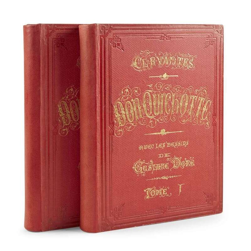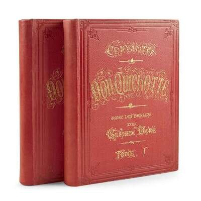 Paris: Hachette, 1869. In two volumes. First edition thus. Folio. Illustrated with 370 wood engraved illustrations after Dore by H. Pisan, including 120 full-page wood engravings. Original quarter red morocco over pebbled cloth-covered boards, stamped in blind and in gilt, minor wear.