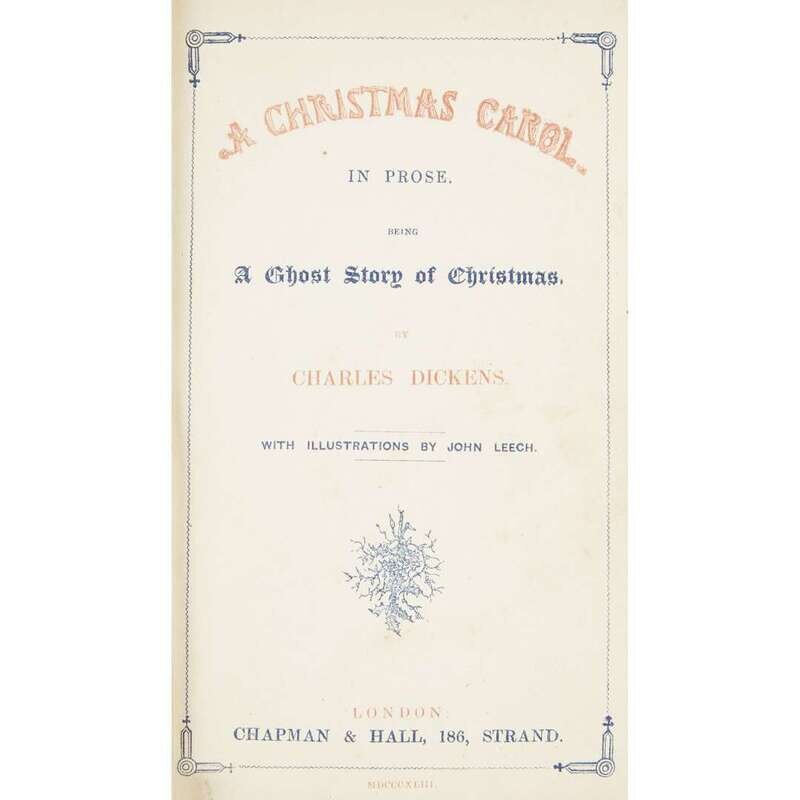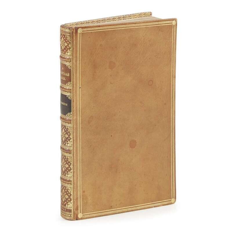 London: Chapman & Hall, 1843. First edition, third issue. With red and blue title-page, blue half-title, “Stave One” on first page of text, uncorrected text. Small 8vo. (vi), (1)-166 pp., 1 leaf ads at rear. Illustrated with four hand-colored engraved plates and 4 woodcut illustrations in text after John Leech. Late 19th or early 20th century polished tan calf, richly stamped in gilt, morocco spine labels, front and rear boards slightly dampstained, lightly rubbed, spine worn; all edges gilt; gilt dentelles; with the original gilt and blind decorated brown cloth covers and spine bound in, minor wear; text block with scattered spotting and soiling. Eckel p.10ff.