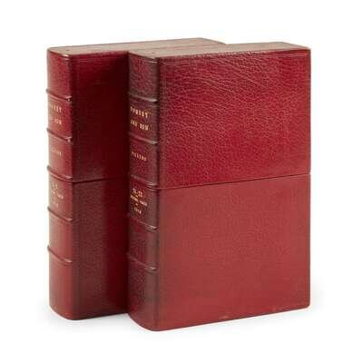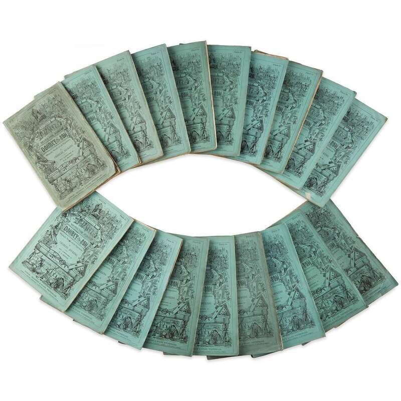 London: Bradbury & Evans, October, (1846)- April, (1848). 20 parts in 19 volumes. First edition in monthly parts. 8vo. Illutrated with frontispiece, vignette title-page, and 38 plates by H.K. Browne, all plates with varying degrees of foxing. Earliest issues of no. IX, XI, XIII, XIV, and with the earlier state two-line errata in the last volume, and with an additional 8 pp. ad at front of seventh volume; lacking rear ad (3) in first volume, lacking rear ad (2) in tenth volume, and lacking front ads (17-24) in last volume. Bound in original limp green illustrated wrappers, front wrapper of seventh volume presumably supplied from another copy, some chipping to spine ends, some scattered creasing and closed tears to wrapper edges, bottom front wrapper corner of last volume repaired; in red levant pull-off case and chemise. Some scattered light wear and spotting to text and ads, glue residue from detached book-plate on front ad in tenth volume, otherwise a beautifully preserved set. With the book-plate of Charles MacA. Willcox in tenth volume. Hatton & Cleaver pp. (225)-250.