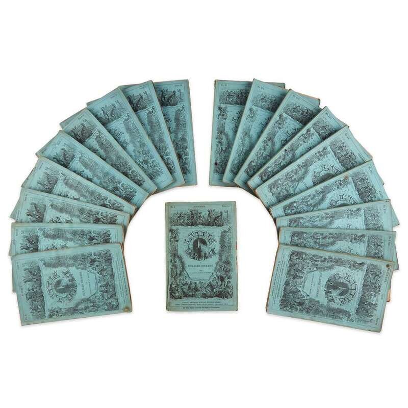 London: Bradbury & Evans, December (1855)-June (1857). 20 parts in 19 volumes. First edition in monthly parts. 8vo. First issue of no. XV, with corresponding slip in no. XVI. Complete with all ads; variant paper used for "Dr. De Jongh" ad at rear of no. V (on orange paper instead of brick-brown paper); some ads unopened; scattered light wear and wrinkling. Illustrated with frontispiece, vignette title-page, and 38 plates by H.K. Browne, foxed and slightly darkened. Bound in limp green illustrated wrappers, scattered wear, spines soiled with some slight repairs, some small closed tears to fore-edges, small open tear at top corner of front wrapper of no. XVIII; in two green linen-covered board fall-down-back boxes. Text leaves in no. XVI bound out of order, ownership signature at head of first leaf in no. I and at head of front wrapper on no. IV, V, and VI, scattered light wear to text and ad leaves, some scattered small closed tears to fore-edges of same. With the book-plate of C.K. Murchison on front ad of each volume.