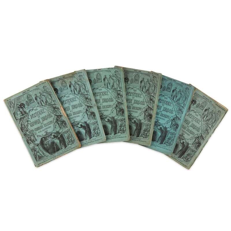 London: Chapman & Hall, April, 1870-September, 1870. In six volumes. First edition in monthly parts. 8vo. Illustrated with vingette title-page and 12 wood-engraved plates by Luke Fildes, and one engraved portrait of Dickens by J.H. Baker. Including "Cork Hats" ad at rear of no. II. Bound in limp green illustrated wrappers, spines repaired on no. I and V, spines replaced on nos. II, III, IV, and VI, other repairs on no. I and VI, scattered chipping and closed tears to all edges, light to moderate soiling; in dark brown levant slipcase and chemise, sunned. Rear ad (2: Reasons for Insuring...) in no. IV torn away, rears ads (2: Chapman & Hall catalogue) and (3: Chapman & Company slip) lacking in no. V, front ads trimmed in no. II, other scattered chipping and closed tears to text and ads, some darkening to text leave edges, scattered foxing. Hatton & Cleaver pp. 371-384.
