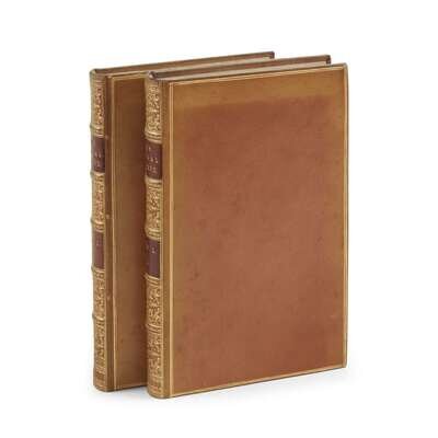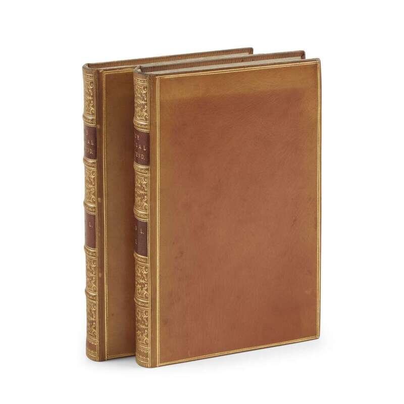 London: Chapman and Hall, 1865. In two volumes. First edition in book form. 8vo. Without three line slip and 36 pp. catalogue sometimes found in first volume and without 24 pp. and 4 pp. catalogues sometimes found in second volume. Illustrated with two frontispieces and 38 engraved plates by Marcus Stone. Full polished tan calf, decoratively stamped in gilt, red morocco spine labels, spine and part of each front board very lightly sunned; gilt board edges; marbled edges; matching marbled endpapers. Smith I, 15.