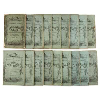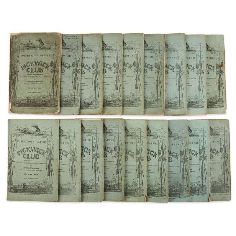 London: Chapman and Hall, (April, 1836-November, 1837). 20 parts in 19 volumes. First edition in monthly parts, mixed issue. 8vo. With two additional leaves laid in to no. I with four mounted postal envelopes (no letters present): one signed by Dickens and addressed to Mr. (Thomas) Justice Talfourd, one signed by George Cruikshank and addressed to (William) Wreford Major, Esq., one signed by Talfourd to Miss Rutt (with trimmed manuscript on verso), and one addressed to Talfourd from an unknown hand; also included are Dickens' book-plate mounted under envelopes, as well as the book-plate of William K. Bixby. Illustrated with frontispiece, vignette title-page and 42 plates by Robert Seymour, Robert William Buss, and Hablot Knight Browne. Bound in limp green wrappers; in red morocco pull-off slip-case and chemise, worn and blistered. Varying degrees of wear, scattered closed tears to wrappers, text, and ads, some foxing and soiling to same. Hatton & Cleaver p. 3-88.