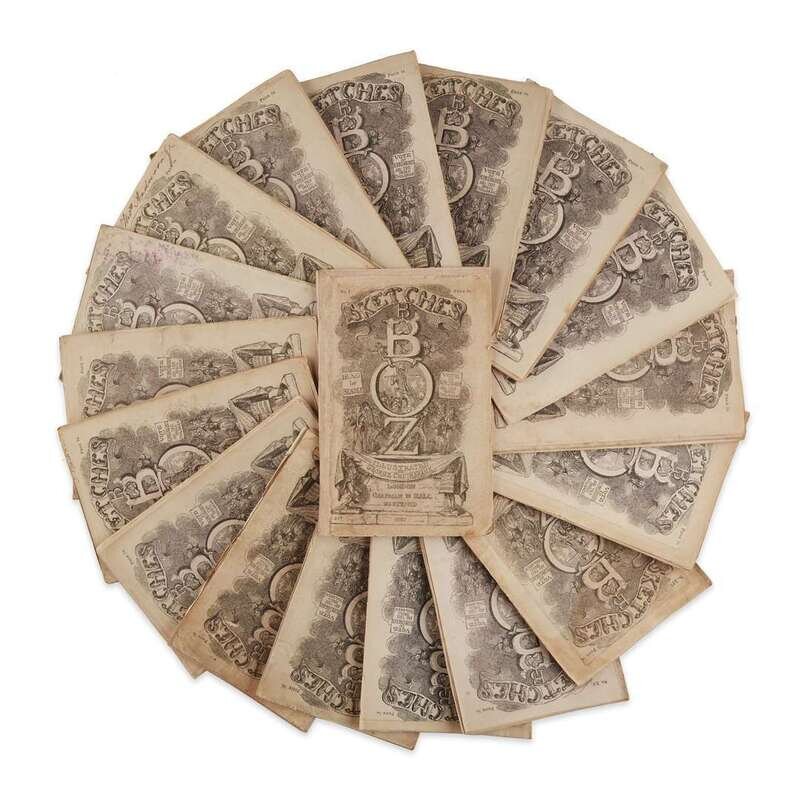 London: Chapman & Hall, (November, 1837-June, 1839). In 20 volumes. First edition in monthly parts. 8vo. Earlier issue of no. IV; no. III lacking 18 pp. Mechi catalogue at rear, otherwise complete. Illustrated with an engraved vingette title-page and 39 plates by George Cruikshank; all plates with varying degrees of foxing. Bound in original limp pink wrappers; in green linen-covered fall-down-back box. Wrappers of no. I repaired, laid down, and trimmed, ownership signature on front wrapper of same; front wrapper of no. II trimmed and with ownership signature, spine chipped and slightly worn, both covers with some soiling and closed tears; ownership signature on front wrapper of no. V and VI; top of front wrapper of no. VIII repaired; top front edge of no. IX trimmed; wrappers of no. XI and XII supplied from another copy, and with printed issue nos. ammended in ink; front wrapper of no. XIII laid down; front wrapper of no. XIV supplied from another copy and laid down; front and rear wrappers of no. XV trimmed; top of front wrapper of no. XVI repaired, and with rear wrapper supplied from another copy; wrappers of no. XVIII supplied from another copy, trimmed and repaired; wrappers for no. XVII, XIX, and XX supplied from another copy; all wrappers with varying degrees of soiling, chipping, and minor paper faults. Scattered small closed tears and creasing to fore-edges of text and ads, other scattered soiling. Hatton & Cleaver pp. 89-128.
