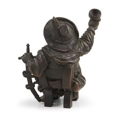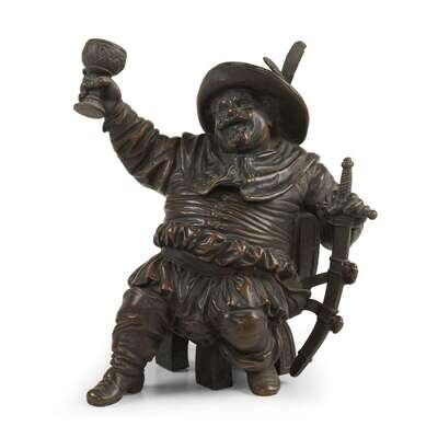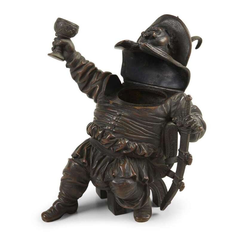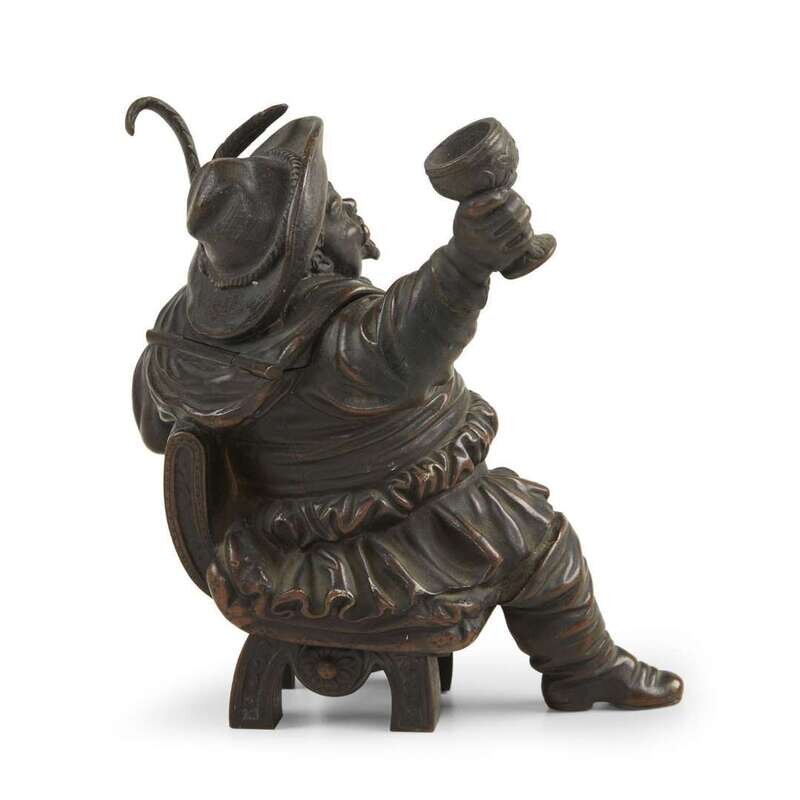 19th century bronze inkwell depicting a toasting Falstaff, 5 1/4in. tall. Hinged head and neck, ink liner wanting. Unsigned and with no foundry mark. Fine condition.