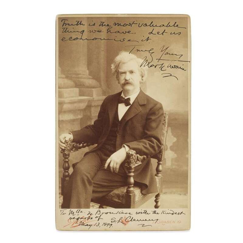 May 13, 1899. Signed and inscribed twice: at top "Truth is the most/valuable thing we have./Let us/economise it./Truly yours/Mark Twain.", and at bottom "To Mlle. De Brouckère with the kindest/regards of/S.L. Clemens/May 13, 1899." Albumen print mounted on card from the Asèle photography studio, Vienna. 6 7/8 x 4 1/4 in. (174.6 x 108 mm).