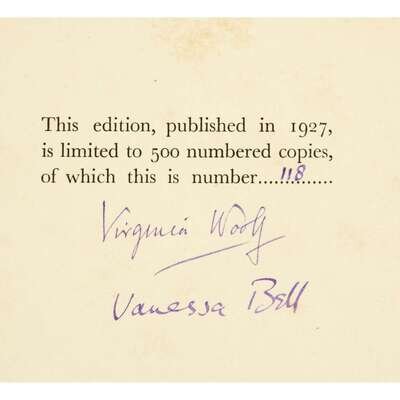 London: Hogarth Press, 1927. Illustrated by Vanessa Bell. First illustrated edition and third overall edition, limited issue of 500 copies signed by author and illustrator, this being #118. 4to. 48 pp. printed to rectos only. Original brown and white paper-covered boards with Vanessa Bell's illustrations, expertly rebacked with original backstrip laid down, front board very slightly bowed, light rubbing to boards and corners, spine slightly darkened; offsetting to endpapers, small bookseller's ticket to rear paste-down, title and limitation pages with moderate foxing, light foxing scattered throughout. [Kirkpatrick A3c].