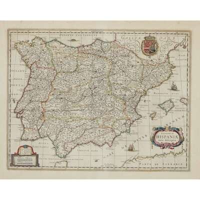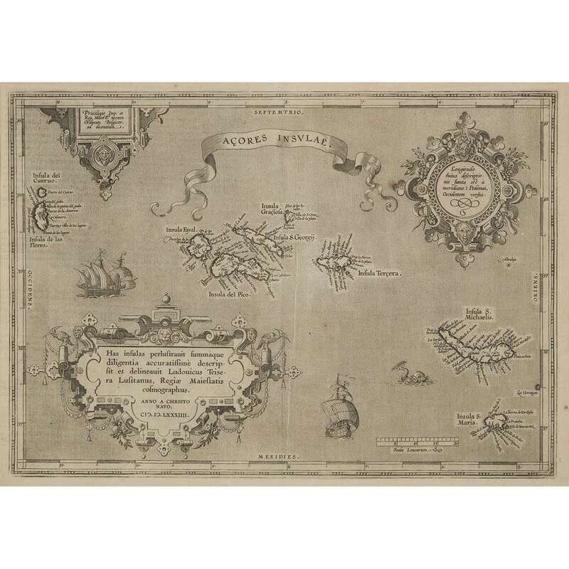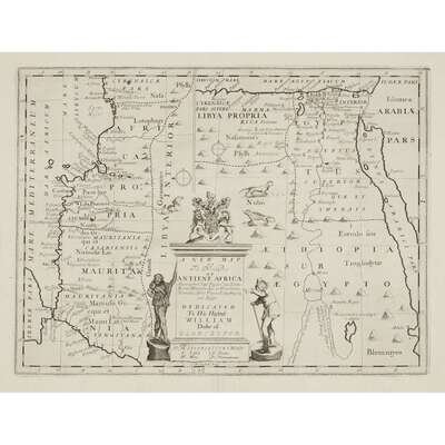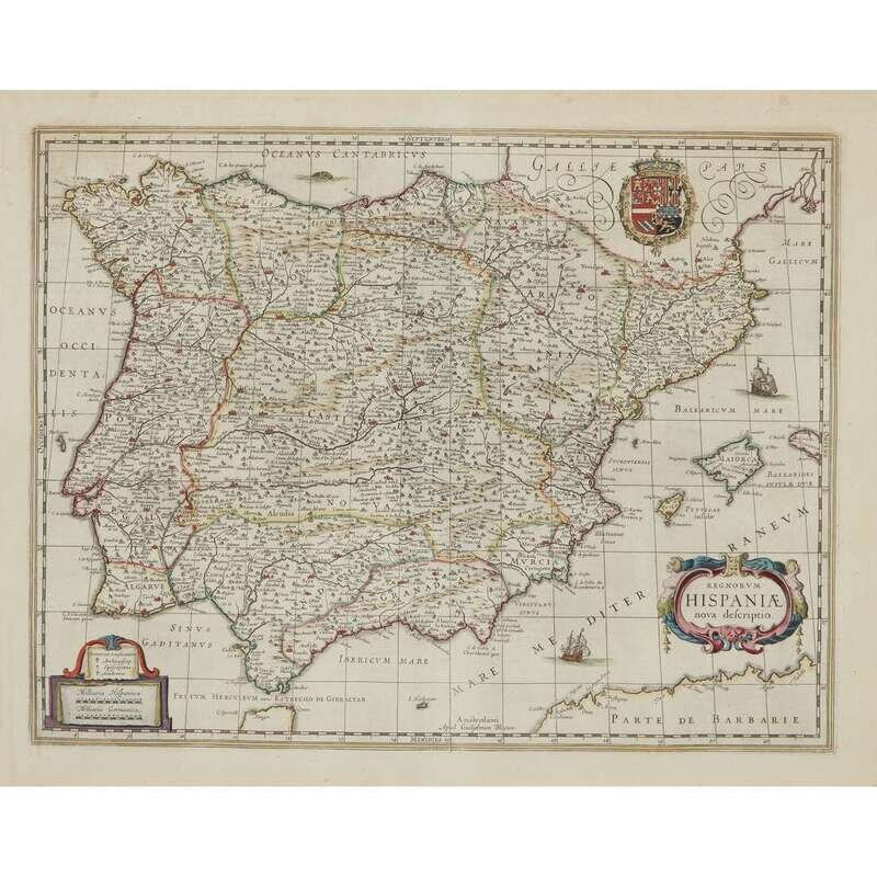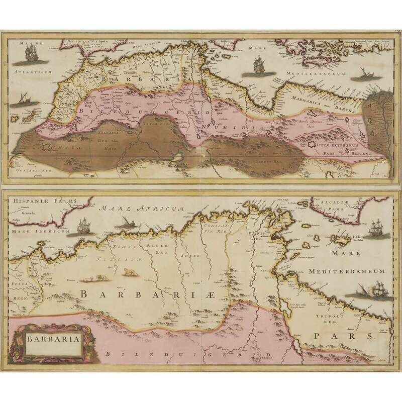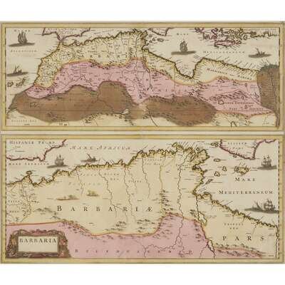 Bleau, Joan "Regnorum Hispsniae nova descriptio" Amsterdam, (ca. 1645). Old and presumably original hand-colored outline, including cartouche, Spanish Royal Coat of Arms, and ships at sea. Dutch text on verso. Plate: 14 3/4 x 19 3/8 in. (375 x 492 mm), with full margins. Hinge mounted, matted and in frame. Browne, Christopher "Barbaria" with [untitled map of the Southern Mediterranean and North Africa] (London, ca. 1697). Two maps from one plate on one sheet. Old and presumably original hand-color. Plate: 19 1/4 x 22 3/4 in. (489 x 578 mm), with wide margins. Hinge mounted and matted. Ortelius, Abraham "Azores Insulae" (Amsterdam, after 1584). Later issue without text on verso. Uncolored. Plate: 13 1/2 x 18 1/2 in. (343 x 470 mm), with wide margins. Lightly and evenly toned. Top hinge mounted and matted. Wells, Edward "A New Map of the North Part of Africa" (London, ca. 1738). Uncolored. Plate: 14 1/2 x 19 3/8 in. (355 x 492 mm), with full margins. Top hinge mounted.