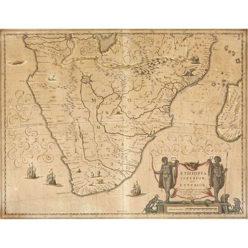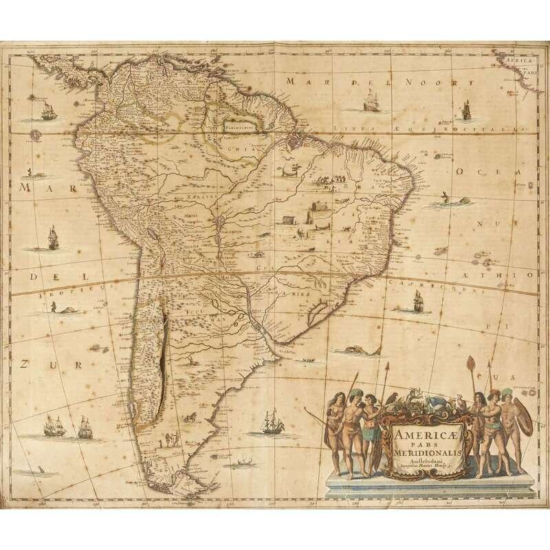 Hondius, Henricus "Amercae pars Meridinalis" Amsterdam, (1641). With hand-colored cartouche and embellishments, including ships and sea monsters, equator and Tropic of Capricorn. French text on verso. Plate: 18 1/16 x 21 3/8 in. (458 x 543 mm), with narrow margins. Moderately to heavily browned, some spotting, brittle, chipping in blank margin, 3 1/2 in. (90 mm) fissure with small chip in body of map at bottom left. With Jansson, Jan "Aethiopia Inferior vel Exterior" (Amsterdam), (ca.1640). Hand-outline color to cartouche and ship embellishments; without the ship found to the west of Madagascar on the earlier Bleau issues. Plate: 15 1/16 x 19 1/4 in. (382 x 489 mm), with narrow margins. Moderately to heavily toned, some spotting.