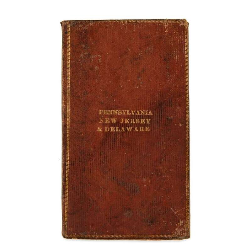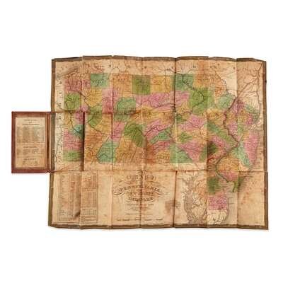 Philadelphia: S. Augustus Mitchell, 1831. 16mo. Hand-colored engraved folding map. 17 x 21 in. (431 x 533 mm). Engraved by J.H. Young. Original straight-grain morocco casing, stamped in gilt, boards rubbed and soiled, spine rubbed, front board corners worn; some separations along map folds, bottom corner panel separating along folds, chipping to edges, tape repairs on verso, toned and foxed.