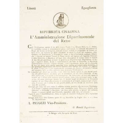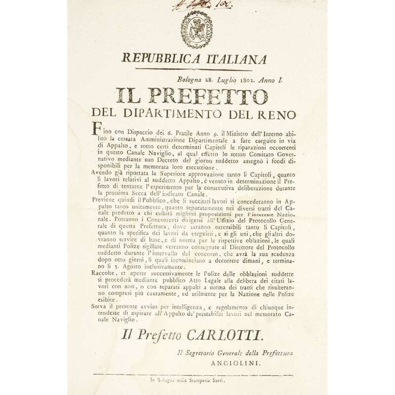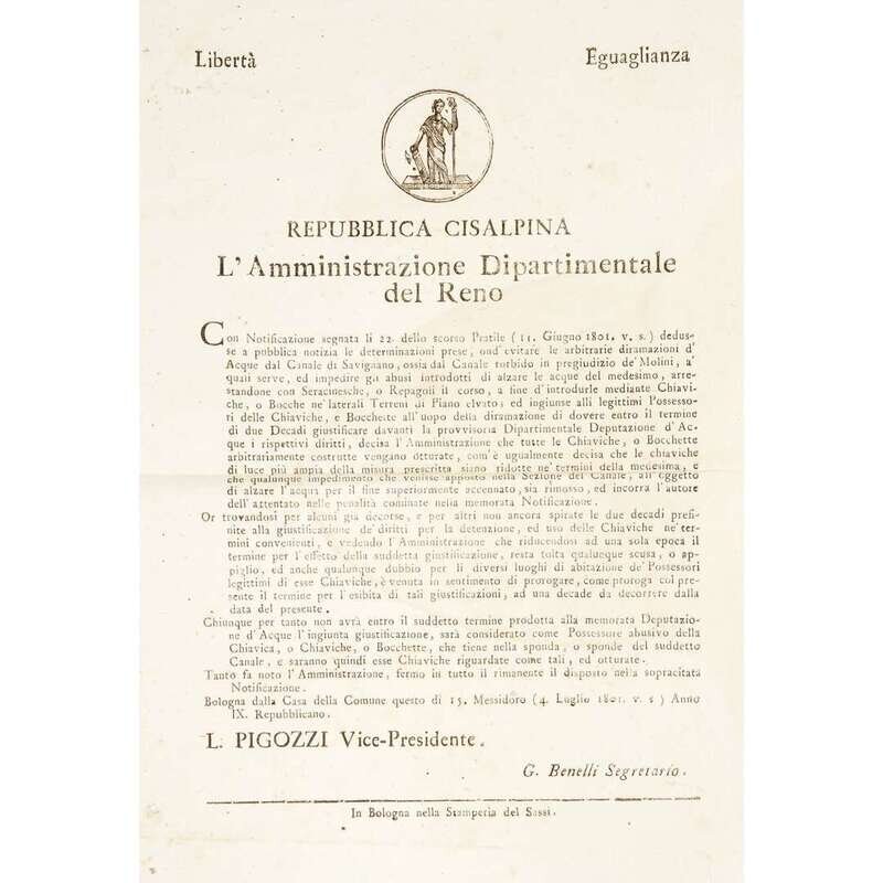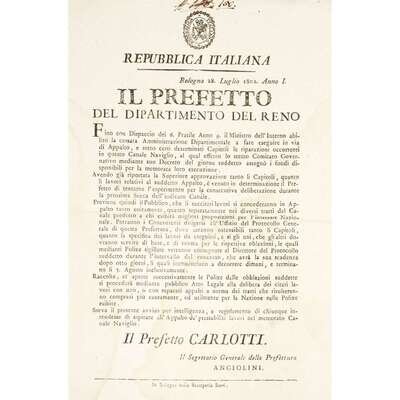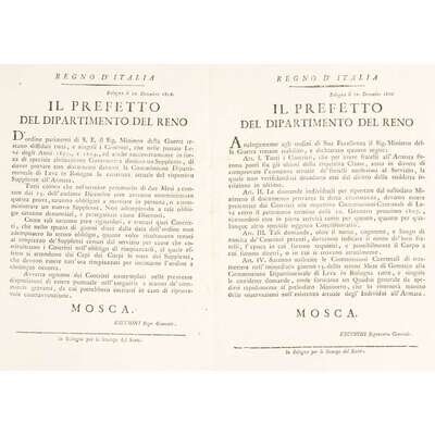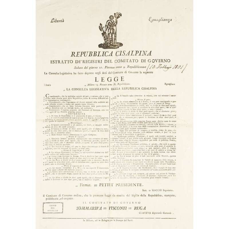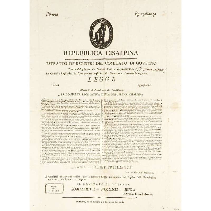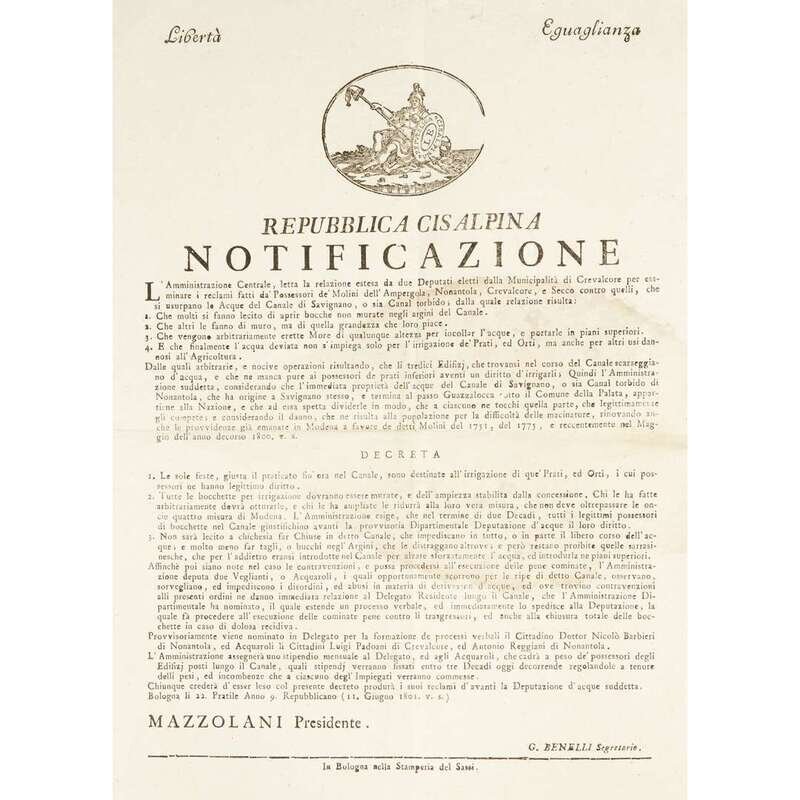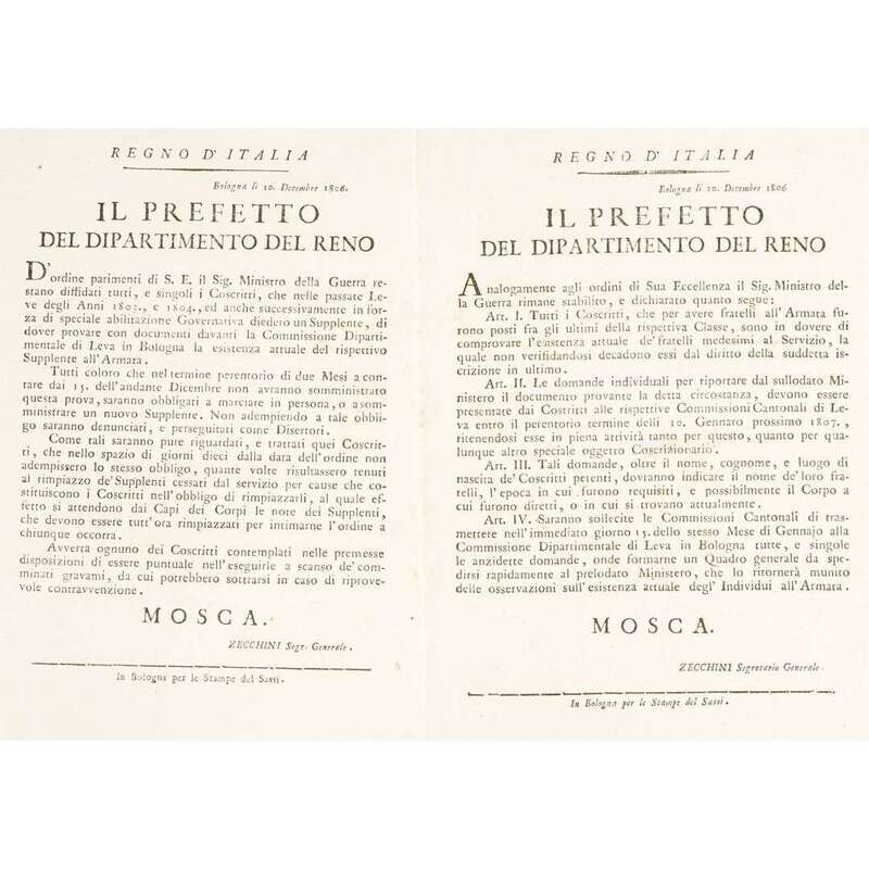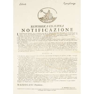 Bologna and Milan, etc, 1800-1806. Sizes vary from approximately 18 x 11 1/4 in. (457 x 286 mm) to 23 1/2 x 17 1/2 in. (597 x 444 mm). Group of 10 original printed broadsides from the short-lived Northern Italian Cisalpine Republic, and the Italian Republic stating various decrees: six broadsides referring to municipal engineering projects for the Canale di Savignano, the Canale di Naviglio, and the via di Appalto, one broadside about instituting a standardized system of measurements throughout the Republic, one broadside about the establishment of new laws and penalties to redress crimes committed and to prevent criminal activity in general, one broadside referring to regulations and duties for newly conscripted soldiers, and one broadside about a livestock and merchandise exhibition.