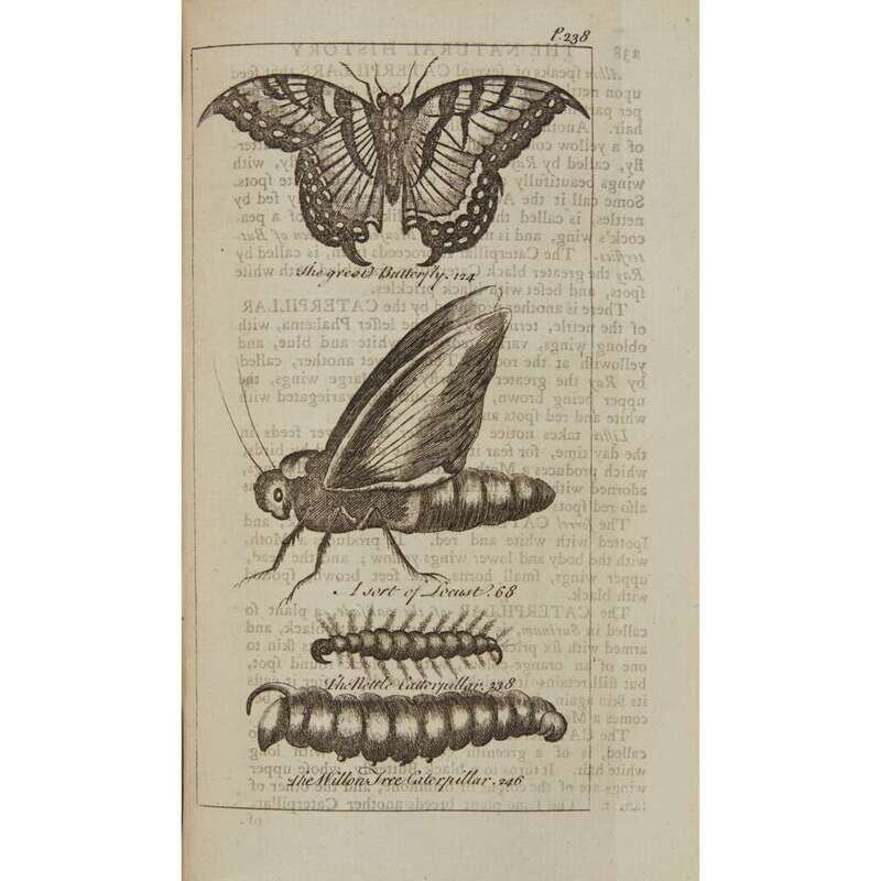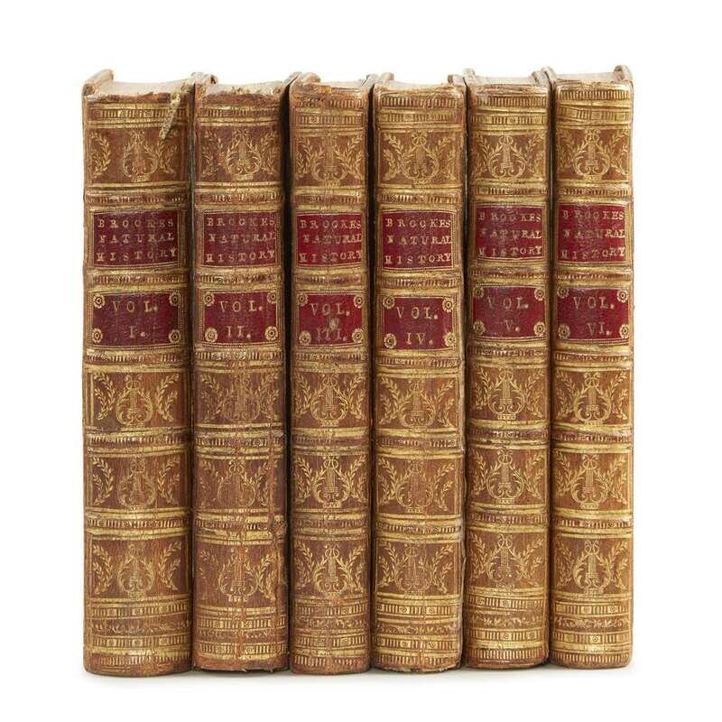 London, 1771-1772. In six volumes. Second edition. 12mo. Illustrated with 146 copper-engraved plates. Each volume with separate title-page, with a collective title-page in first volume only (a separate title-page for the Quadrupeds also appears). The second volume is dated 1771, the others 1772. Contemporary speckled brown calf, gilt spine compartments, burgundy morocco spine labels, spine ends and joints rubbed; scattered old manuscript shoulder notes, with the armorial book-plate of Sir John Vanhattem, Dinton Hall, Bucks on each front paste-down. ESTC T 118916.