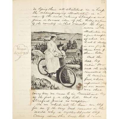 [Philadelphia, Pennsylvania]: 1895-1896. 4to. 151 pp. Manuscript journal, bound in quarter sheep and brown paper-covered boards with white paper title label to front board, printed in black, worn to extremities and lacking backstrip, both boards disbound but present; text block mostly intact with a few gatherings separated, complete with table of context and afterword. Illustrated with printed graphics and newspaper clippings tipped in by the author.