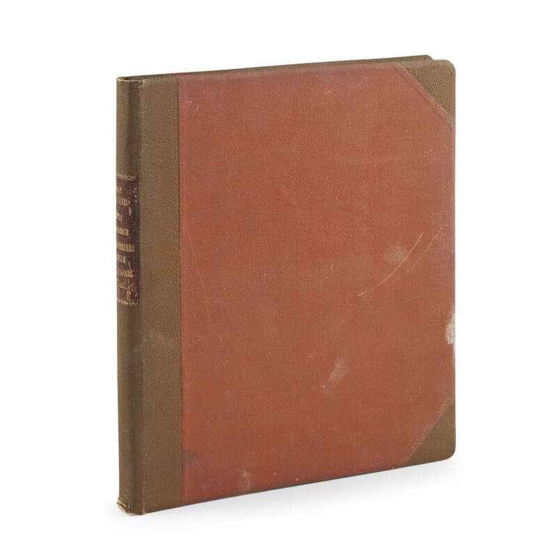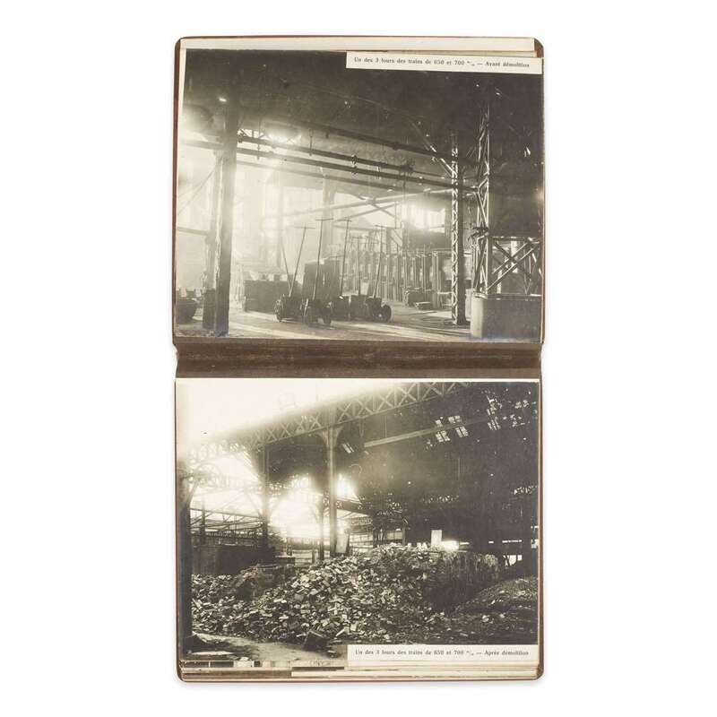 Dampremy, Belgium, no date (ca. late 19th/early 20th century). Spine titled "Etat des usines de la Providence a marchiennes Belgique avant et apres les evenement". Featuring 28 photographic prints depicting the various stages of the demolition of the Providence Steel Company factory; all mounted to board, with caption slips pasted in bottom margin. Contemporary three-quarter brown pebbled cloth over red pebbled cloth, red leather spine label, stamped in gilt, boards slightly worn, spine label slightly rubbed and blistered.
