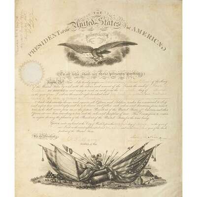 Washington, August 24, 1848. 1 p. Folio on vellum. 18 3/4 x 15 1/2 in. (476 x 394 mm). Document signed by President Polk and countersigned by Secretary of War William Learned Marcy, appointing "Samuel G. Beach First Lieutenant, By Brevet…from the seventeenth day of August...1847 'for gallant and meritorious conduct in the battles of Contreras and Churubusco". With engraved vignettes and paper seal. Docketed at upper left recto. Manuscript contents slightly browned.