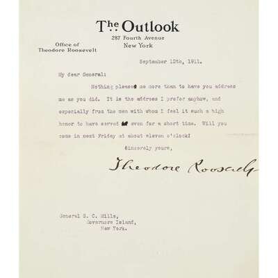 New York: September 12th, 1911. 1 p. on The Outlook stationary. Addressed to General S. C. Mills: "My dear General: Nothing pleases me more than to have you address me as you did. It is the address I prefer anyhow, and especially from the men with whom I feel it such a high honor to have served even for a short time. Will you come in next Friday at about eleven o'clock? Sincerely yours, Theodore Roosevelt." With one-inch closed tear to right margin at center fold, not affecting text.