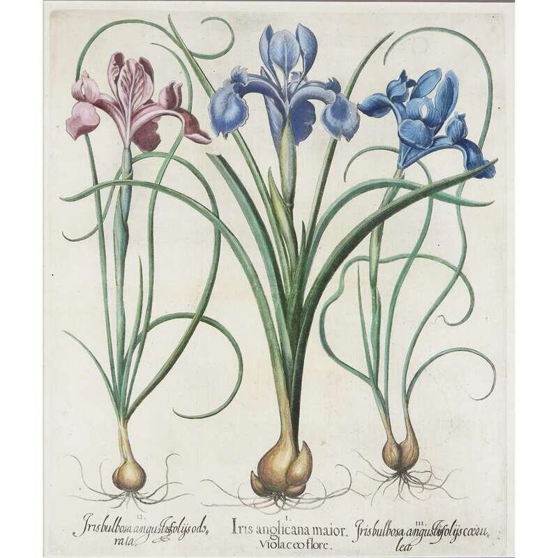 "(I.) Iris Anglicana major, violaceo flore (II.) Iris bulbosa angustisfolijs odorata; (III.) Iris bulbosa angustisfolijs caerulea." Hand-colored Engraving. 19 1/16 x 16 13/16 in. (484 x 427 mm), with wide margins. Image lightly and evenly toned, some minor dust smudging at edges. Top hinge mounted, matted and in frame. [Hortus Eystettensis. Ingolstadt, 1713, Third Edition].