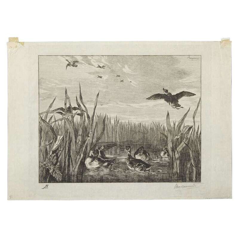 Ca. 1850-1860s. Etching. Signed by Bracquemond in pencil below image, also signed by him in the plate at top right corner and initialed in the plate at bottom left. Tape remnants from old mount at top corners verso. Plate: 9 3/4 x 12 7/8 in. (250 x 330 mm), sheet: 11 x 15 7/8 in. (280 x 400 mm). Beraldi 111, edition unknown.